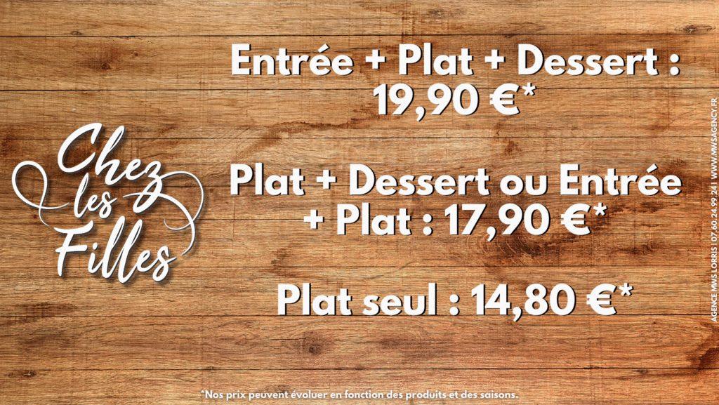Chez les Filles, le menu change chaque jour pour vous garantir fraîcheur et gourmandise. Retrouvez nos plats du jour mis à jour quotidiennement sur notre page Facebook.